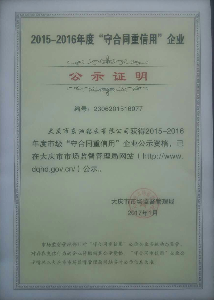 大慶市東油鉆采有限公司獲得2015-2016年度市級“守合同重信用”企業(yè)公示資格,已在大慶市市場監(jiān)督管理局網(wǎng)站公示。